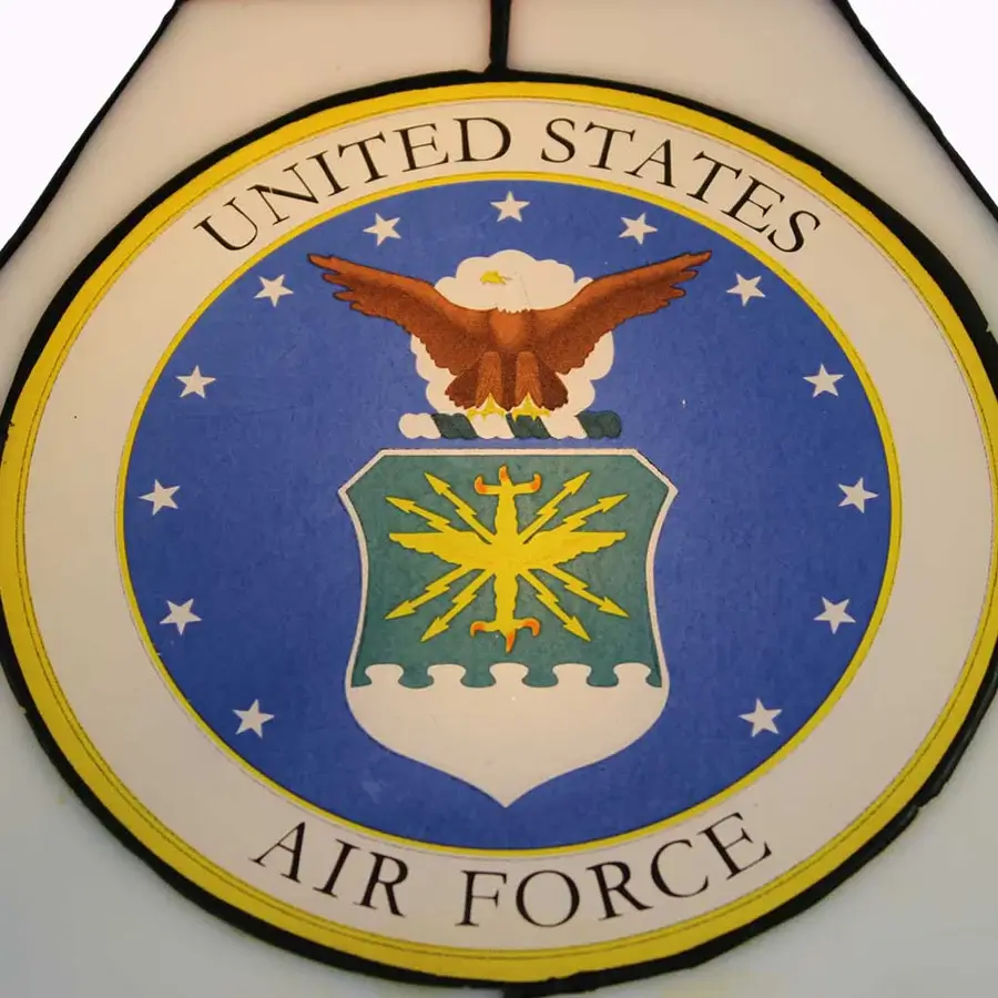 A U.S. Air Force Mission Table Lamp featuring detailed stained glass panels and a structured design for balanced ambient lighting.